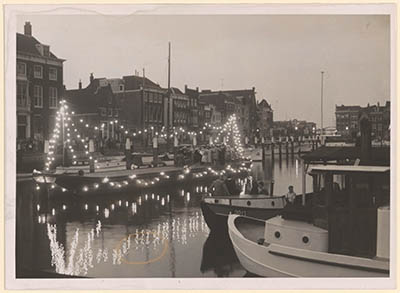 Verlicht vaartuig in de Nieuwe Haven tijdens de …