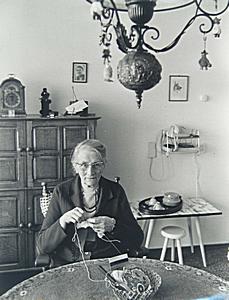 Portret van een breiende dame in een jaren 50/60 interieur
