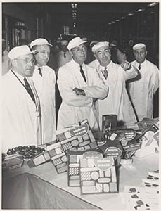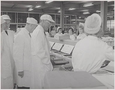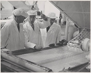 Prins Bernhard tijdens zijn bezoek aan de Victoria-fabriek.