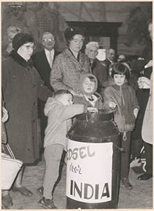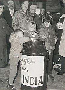 Drie kinderen deponeren hun bijdrage in een collectebus …