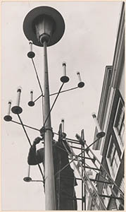 Het bevestigen van feestverlichting aan een paal op het …