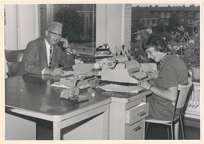 H. Nicolaas met secretaresse Mej. A. Holster achter hun …