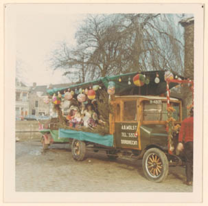 Oude vrachtwagen van transportfirma A.B. Wolst, versierd …