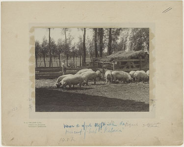 Varkens op een erf en boerenjongetje.