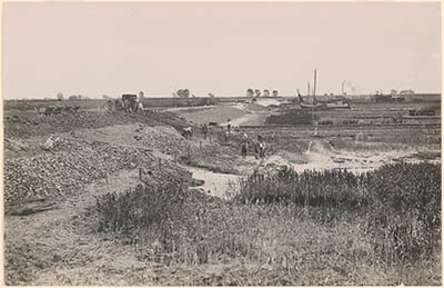 Een rij op rails staande kiepkarren bij de inpoldering …
