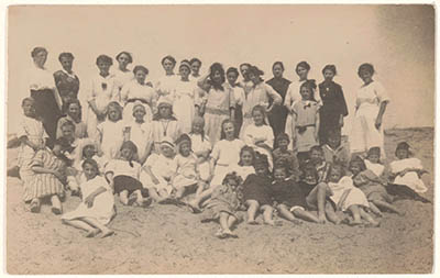 Een groepje zondagsschoolleerlingen op een steiger aan …