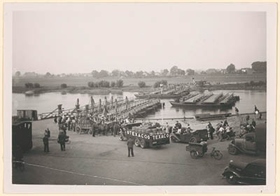 Bouw van een schipbrug over een vrij smalle rivier …