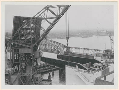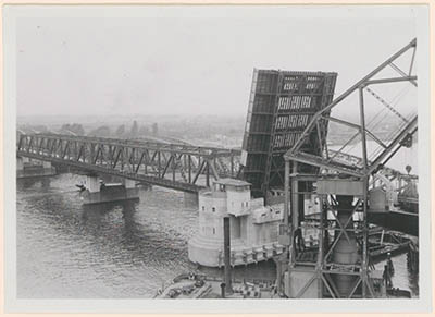 Plaatsing van de klep aan de verkeersbrug over de Oude Maas.