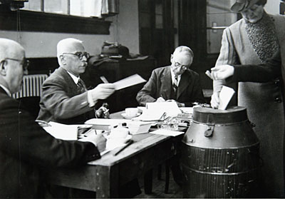 De heer H. van Gijn als voorzitter van een stembureau.