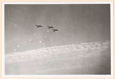 Landing van Duitse parachutisten boven weilanden te …