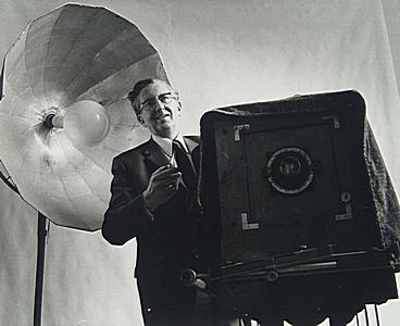 Fotograaf H.G. Beerman met een oude glasplatencamera. …