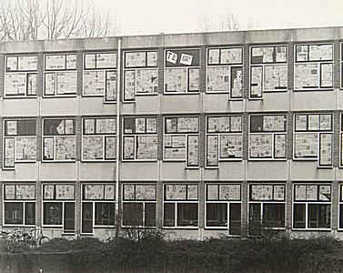 Met kranten dichtgeplakte ramen van de Gemeentelijke …