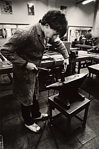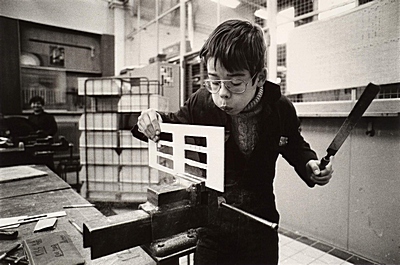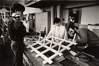 Leerlingen aan het werk in de timmerwerkplaats van de …