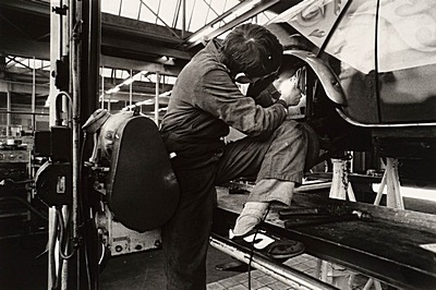 Leerling van de ambachtsschool sleutelt aan een auto