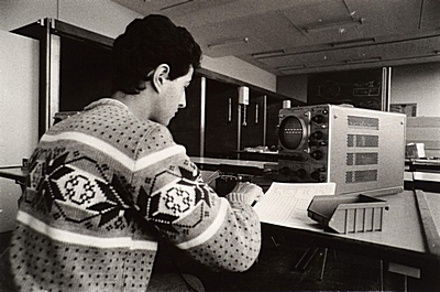 Leerling van de ambachtsschool met een oscilloscoop