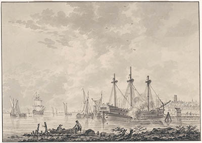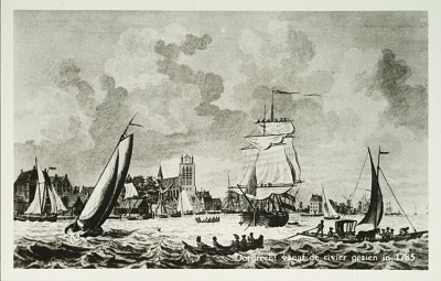 Dordrecht vanaf de rivier (Oude Maas) gezien in 1785.
