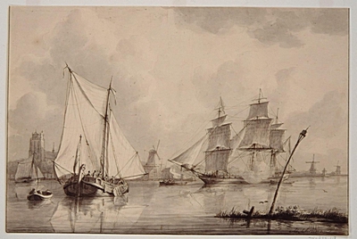 Gezicht op Dordrecht vanuit Zwijndrecht; op de rivier …