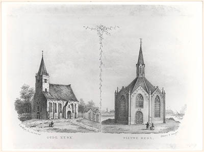 Litho van twee hervormde kerkgebouwen te Alblasserdam. …