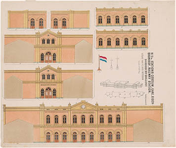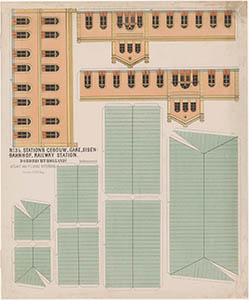 Bouwplaat (voor kinderen) van het stationgebouw.