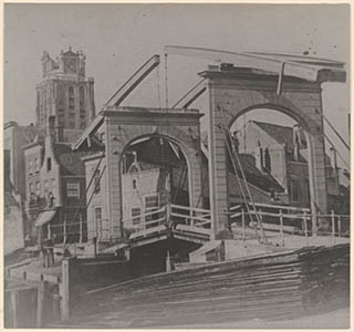 Nieuwe Haven met Lange IJzerenbrug en Grote Kerk; op de …