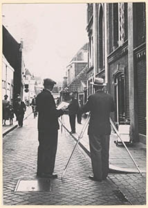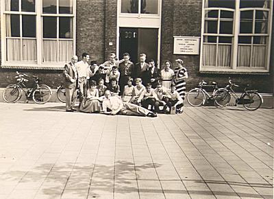 Ulo Stek met een groep leerlingen voor de deur; links J. …