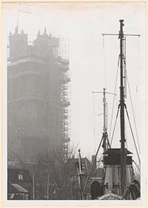 De Grotekerkstoren in de steigers en in de mist, gezien …