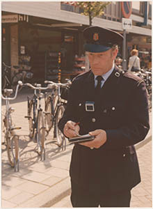 Parkeerwachter G. v.d. Heuvel, een parkeerbon schrijvend …