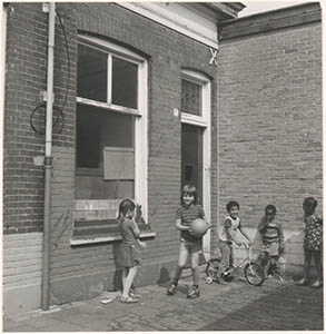 Kinderen in een hoekje van de Fortuinhof voor het huis op …