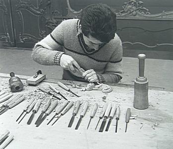 Restaurateur aan het werk met houtsnede voor het …