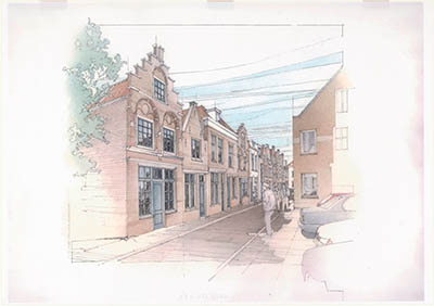 Aquarel de van Kleine Spuistraat ter hoogte van de …