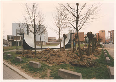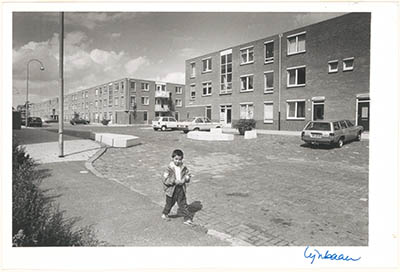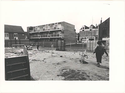 Speelplaats ten zuiden van het Kromhout (achtergrond) bij …