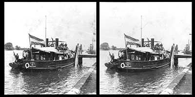 Stereofoto van instructieschip H.M. Das, een kanonneerboot.