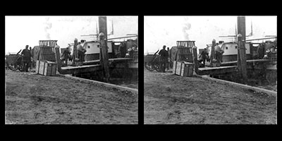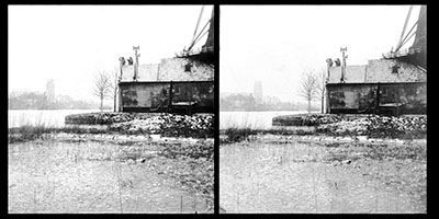 Stereofoto van een plankier langs de Zwijndrechtse oever.
