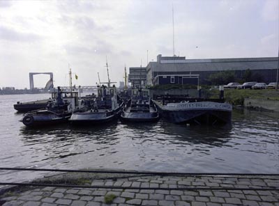 Afgemeerde schepen in de Oude Maas voor de Maasflat aan …