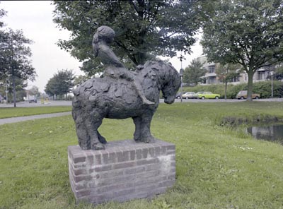 Kunstwerk "Pony met kind" van Hans Bayens (1970) tussen …