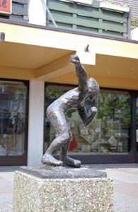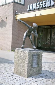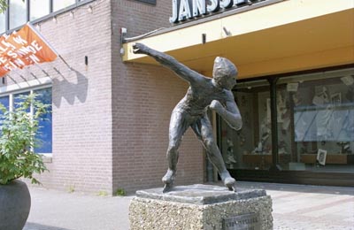 Beeld van schaatser Kees Verkerk bij het winkelcentrum op …