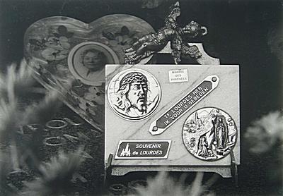 Grafsteen met herinneringen aan bedevaartsplaats Lourdes …