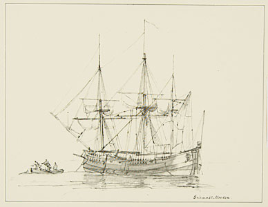Driemasthoeker (zeilschip) met roeibootje, ca. 1800.