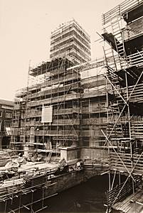 Stadhuis in de steigers vanaf de Lombardbrug.