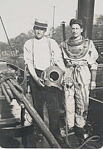 Man in duikerspak op een boot in de Nieuwe Haven