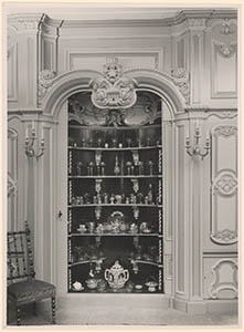 Een ingebouwde kast met glaswerk en porselein in een …