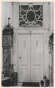 Halinterieur met bewerkte deur en bovenlicht, staande …
