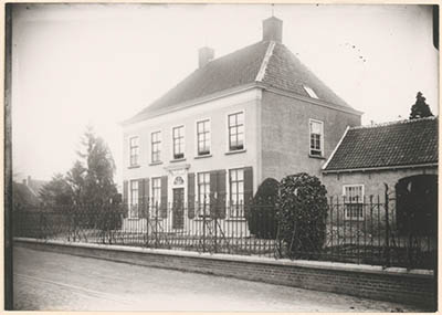 Herenhuis met koetshuis achter een sierhek.